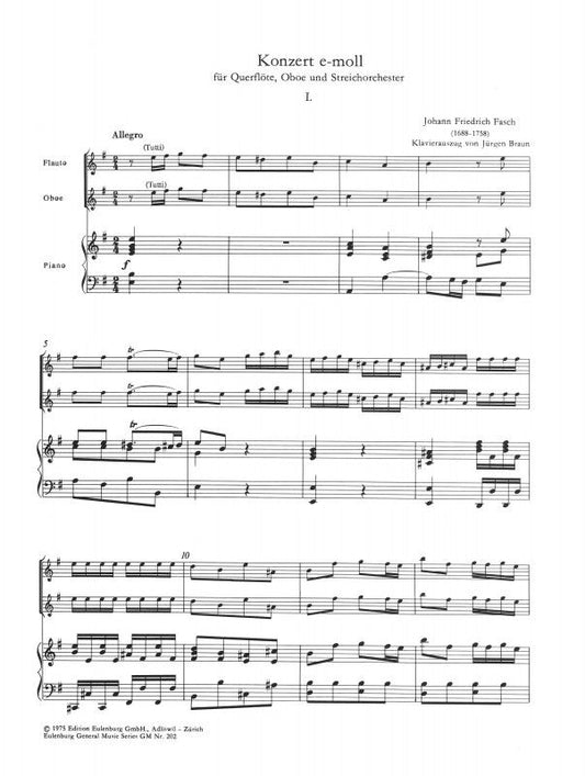 Fasch, Johann Friedrich: Concerto for flute, Oboe and string orchestra in E minor , reduction