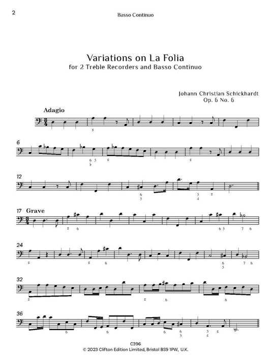 Schickhardt: Variations on La Folia Op. 6 No. 6 – Two Treble Recorders & Continuo - Digital Download