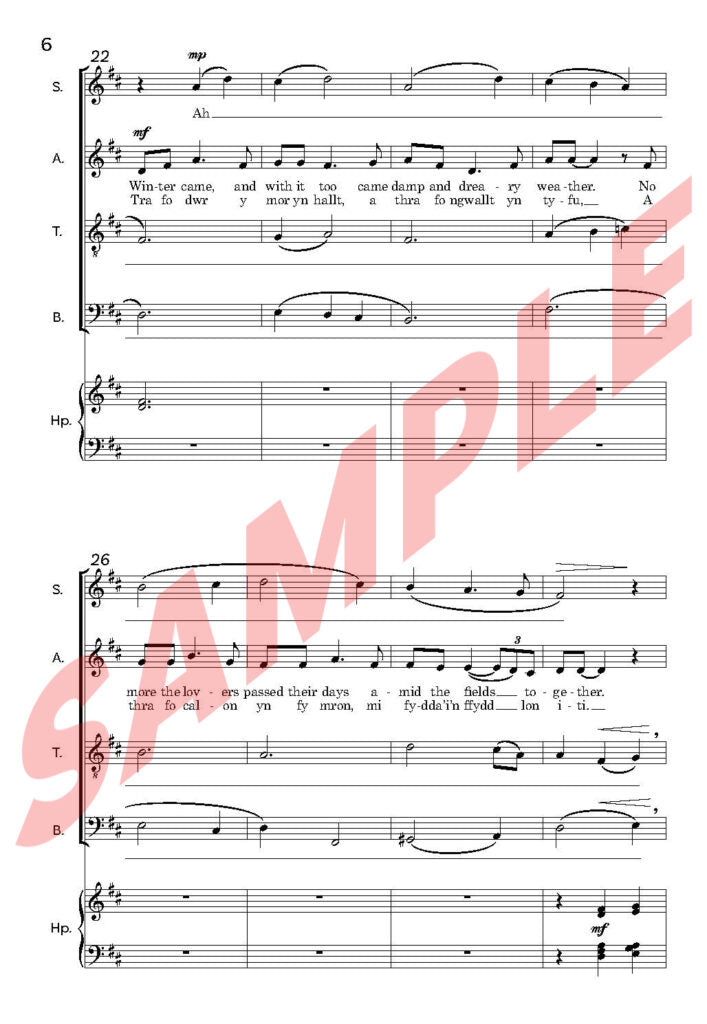 Gwyn Parry-Jones’ arrangement of the famous Welsh folk-song “Bugeilio’r Gwenith Gwyn” (for Soprano and SATB choir) has harp accompaniment for which piano may be substituted.