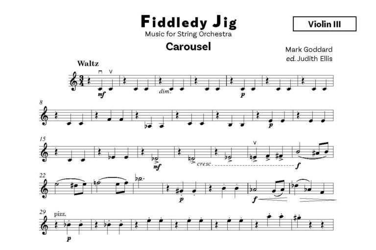 Fiddledy Jig is an engaging suite of four dance-like pieces for the student string orchestra. The music, which was first published in 1992 by Spartan Press, employs familiar musical genre to great effect and utilises pizzicato, arco, tutti, solo, D.C. al Fine plus an occasional glissando! The violas can be supplemented or replaced by Violin III.
