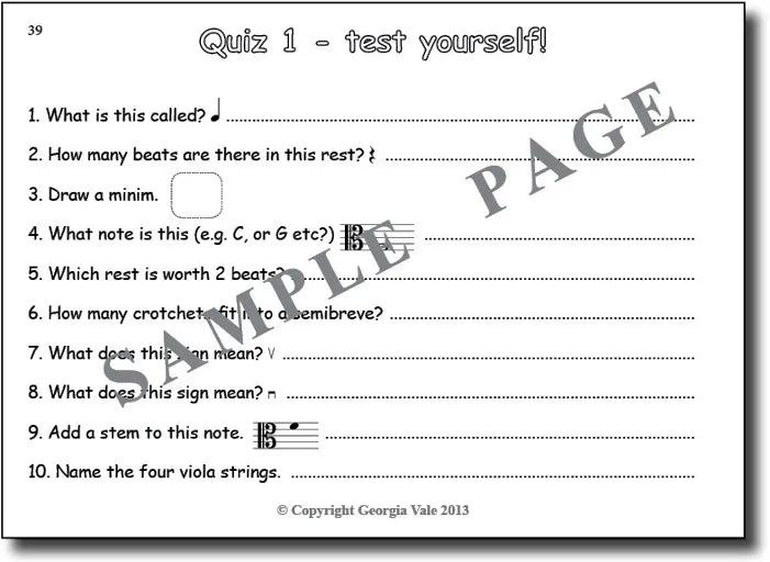 (PDF version of Hey Presto! Music Theory for Violists, Book 1) First workbook in the series (6 books), designed to take beginners on the viola to Grade 1 theory level and beyond, relating it to their instrument, and building confidence right from the start.This book gently introduces all the things a beginner might come across in their first few months of learning the viola, using clear, concise and easy to follow explanations. All of the important subjects are repeated in varying ways, the characters Presto, Bravo and Poco help to bring the subject to life and fun pages also help to make this a highly enjoyable introduction to music theory.